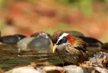 红额金翅雀:共有14个亚种。小型鸟类,体长12-14厘米。额、脸颊和颏朱红色,眼先和眼周黑色,在淡色的头部极为醒目。上体灰褐或乌褐色,尾上覆羽白色,两翅和尾黑色,翅上有黄色斑。下体喉、胸灰褐或乌褐色…全部>>