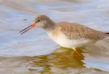 红脚鹬:体长28厘米,上体褐灰,下体白色,胸具褐色纵纹。飞行时腰部白色明显,次级飞羽具明显白色外缘。尾上具黑白色细斑。虹膜黑褐色,嘴长直而尖,基部橙红色,尖端黑褐色。脚较细长,亮橙红色,…全部>>
