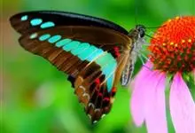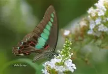 青带凤蝶Graphium sarpedon ,又名青凤蝶,是最普遍的中型凤蝶,飞行速度很快。青带凤蝶的翅膀中央有许多浅蓝色的斑点,很整齐地排列成一条直线。这些斑点由上而下逐渐变大,就像一条青色的带子。全部>>