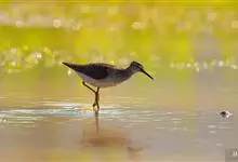 泽鹬:小型涉禽,体长19-26厘米。嘴长,相当纤细,直而尖。颜色为黑色,基部绿灰色,脚细长,暗灰绿色或黄绿色。夏季上体灰褐色具黑色斑,腰白色并向下呈楔形延伸。下体白色,颈、胸具细的黑色纵纹。…全部>>
