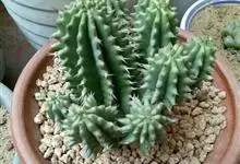 魁伟玉原产南非,是一种大戟科的多年生肉质植物,植株具粗圆筒形肉质茎,有10条以上的突出棱,表皮绿色至灰绿色,披有白粉,有较为明显、平行排列的深色横肋,刺生于棱缘上,红褐至深褐色,易脱落。小叶早脱落,…全部>>
