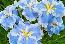 花菖蒲:是玉蝉花的变种。多年生宿根挺水型水生花卉。根状茎短而粗,须根多并有纤维状枯叶梢,叶基生,线形,叶中脉凸起,两侧脉较平整。花葶直立并伴有退化叶1-3枚。花大直径可达15厘米。外轮三片花瓣呈椭圆…全部>>