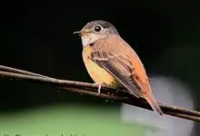 棕尾褐鹟:体重9-16克;体长109-122毫米,是一种体型略小的红褐色鹟。眼圈皮黄,喉块白,头石板灰色,背褐,腰棕色,下体白,胸具褐色横斑,两胁及尾下覆羽棕色。通常具白色的半颈环。…全部>>