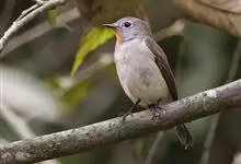 橙胸姬鹟:体长12-16厘米,是一种体型略小的林栖型鹟。尾黑而基部白,上体橄榄褐色,额具一白色横带,两端向上延伸至眼上形成眉斑。翼橄榄色,下体灰。成年雄鸟额上有狭窄白色并具小的深红色项纹,常不明显。…全部>>