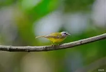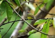 黑脸鹟莺:体长10厘米,是有特色的体小而多彩的莺鸟。粗眉纹,颏、喉及尾下覆羽黄色,脸罩黑,头顶及颈背灰色,上体绿,无翼纹,腹白。虹膜褐色;上嘴色深,下嘴肉色;脚偏绿色。…全部>>