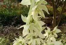 丝兰是天门冬科丝兰属植物。茎短或无茎;圆锥花序烛台状,花朵杯形,下垂,白色;叶基部呈剑形放射状,被白粉,革质;花期8—10月。丝兰原产于北美,在中国长江流域一带和华北地区均有栽培,长江以南地区也有分布。…全部>>