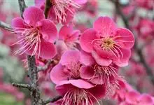 宫粉梅 Rehd.)是蔷薇科、李属植物,梅花品系中真梅系直枝梅类宫粉型,其花复瓣至重瓣,呈或深或浅的红色。落叶乔木,高达10米。树干褐紫色,有纵驳纹,小枝细而无毛,多为绿色。叶广卵形至卵形,…全部>>