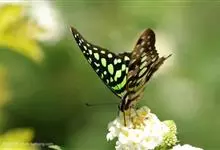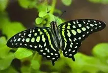 青带凤蝶Graphium sarpedon ,又名青凤蝶,是最普遍的中型凤蝶,飞行速度很快。青带凤蝶的翅膀中央有许多浅蓝色的斑点,很整齐地排列成一条直线。这些斑点由上而下逐渐变大,就像一条青色的带子。全部>>