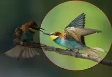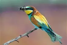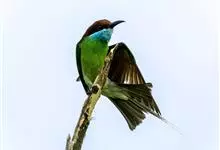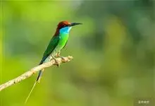 栗喉蜂虎是蜂虎科蜂虎属的鸟类。有热带鸟类羽毛艳丽的特征:喉部是栗红色的,黑色的过眼纹,翅膀和背部是绿色的,尾翼是蓝色的,飞行时翅膀下面的羽毛是橙黄色的,在阳光的照射下,它们全身闪烁着金属般的艳丽光泽,…全部>>