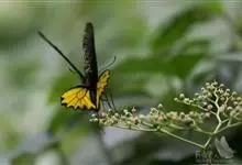 荧光裳凤蝶是凤蝶科裳凤蝶属的一种大型蝴蝶,该物种共有3个亚种。该蝶飞翔的时候姿态优美,前翅黑色,后翅金黄色和黑色交融的斑纹在阳光照射下金光灿灿,显得华贵美丽。幼虫寄主为多种马兜铃属的植物,取食马兜铃…全部>>