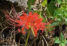 石蒜[学名:Lycoris radiata Herb.],是石蒜科石蒜属的多年生草本植物,别名彼岸花、红花石蒜、死人花、蟑螂花、龙爪花等。石蒜的叶狭带状,中间有粉绿色带,秋季出叶。伞形花序,花鲜红色。…全部>>