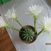 仙人球花 仙人掌科,仙人球属。植株单生或成丛。幼株球形,老株长成圆筒状,高可达75厘米,直径12-15厘米。球体暗绿色,具棱11-12。刺锥状,黑色,长1-1.5厘米。花着生于球体侧方,大型嗽喇叭状…全部>>
