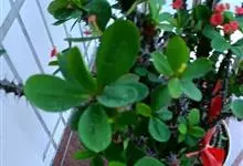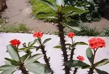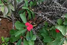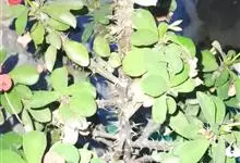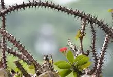 虎刺梅:别称铁海棠,是蔓生灌木植物。茎多分枝,长60-100厘米,直径5-10毫米,具纵棱,密生硬而尖的锥状刺,刺长1-1.5厘米,直径0.5-1.0 毫米,常呈3-5列排列于棱脊上,呈旋转。叶互生…全部>>