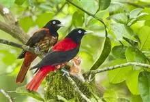 朱鹂:中等鸟类,体长23-28厘米。雄鸟绛紫红色,头、上胸及翼黑色。雌鸟上背及背部深灰色,尾覆羽及尾绛紫红色,腹部及下胸白而密布黑色纵纹。与鹊色鹂幼鸟的区别在上背灰色较深,下体白色较少且纵纹较粗。…全部>>