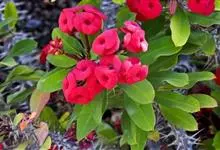 铁海棠为大戟科大戟属蔓生灌木植物;茎多分枝,具纵棱,呈旋转状;叶互生,通常集中于嫩枝上;每个花序基部边缘具微小的红色尖头;苞叶先端圆且具小尖头,无柄,上面鲜红色,下面淡红色;苞片丝状;子房光滑无毛,…全部>>