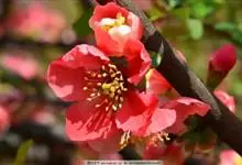 贴梗海棠 Nakai)是蔷薇科、木瓜海棠属植物。落叶灌木,高达2米,枝条直立开展,有刺。叶片卵形至椭圆形,稀长椭圆形,长3-9厘米,宽1.5-5厘米。花先叶开放,3-5朵簇生于二年生老枝上。…全部>>