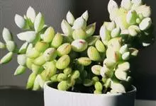 鹿角海棠是番杏科鹿角海棠属多浆肉质灌木。老枝呈灰褐色,木质化,嫩枝为淡绿色,分支处有节间;叶交互对生,呈半月形,三棱状,为粉绿色至灰绿色,叶端狭窄,先端尖锐;叶尖微粉红色,叶背有龙骨状突起,…全部>>