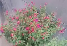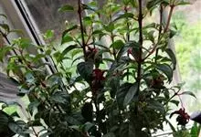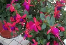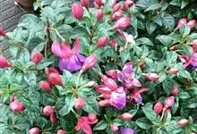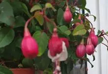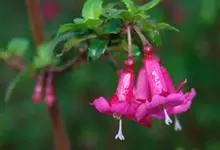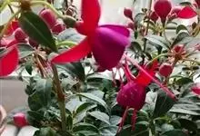 倒挂金钟是柳叶菜科倒挂金钟属亚灌木植物。茎直立,多分枝;幼枝带红色,被短柔毛与腺毛,老时渐无毛;叶对生,卵形或窄卵形,脉常带红色;常带红色,被短柔毛与腺毛;花筒红色,筒状钟形,…全部>>