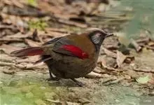 丽色噪鹛是红翅噪鹛的指名亚种。中型鸟类,体长23-28厘米。头顶灰橄榄褐色具粗著的黑色纵纹,头侧、颏、喉黑色,耳羽灰白色具黑色纵纹。背和胸、腹棕褐色,两翅具一大的鲜红色斑,尾亦为鲜红色。特征极明显,…全部>>