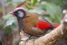 赤尾噪鹛中型鸟类,体长24~28厘米。头顶至后颈红棕色,两翅和尾鲜红色,眼先、眉纹、颊、颏和喉黑色,眼后有一灰色块斑。其余上下体羽大都暗灰或橄榄灰色。特征极明显,特别是通过鲜红色的头顶、翅和尾。…全部>>