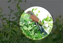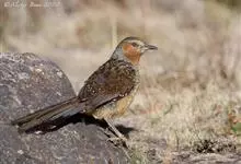大噪鹛:中型鸟类,体长32-36厘米。额至头顶黑褐色,背栗褐色满杂以白色斑点,斑点前缘或四周还围有黑色。初级覆羽、大覆羽和初级飞羽具白色端斑。尾特长,均具黑色亚端斑和白色端斑。颏、喉棕褐色,…全部>>