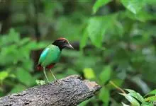 绿胸八色鸫:是雀形目八色鸫科的鸟类,共有12个亚种。体长为16-18厘米,体重65-69克。体型圆胖,尾短,腿长。头黑,上体绿色,两翼深色而具白色斑纹,头顶至后枕深褐,胸及腹部苹果绿,臀亮红。…全部>>