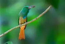 蓝须夜蜂虎是佛法僧目、蜂虎科的鸟类,体长约30厘米,是绿色林栖型蜂虎,蓝色的胸羽蓬松,嘴厚重而下弯。成鸟顶冠淡蓝,腹部棕黄带绿色纵纹。尾羽腹面黄褐。亚成鸟全身绿色。喉、胸部中央的羽甚长和亮色;该物种…全部>>
