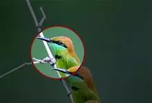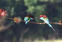 栗喉蜂虎是蜂虎科蜂虎属的鸟类。有热带鸟类羽毛艳丽的特征:喉部是栗红色的,黑色的过眼纹,翅膀和背部是绿色的,尾翼是蓝色的,飞行时翅膀下面的羽毛是橙黄色的,在阳光的照射下,它们全身闪烁着金属般的艳丽光泽,…全部>>
