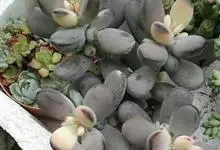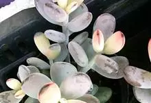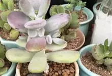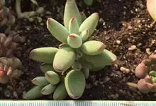 乒乓福娘,植株叶片退化成扁卵状,植株为直立的肉质灌木,能够长高。叶片对生,扁卵型至圆卵形,叶片顶端紫红圆叶尖,叶面有一层白粉。强光下叶片的顶端边缘会较红。初夏开花,聚伞状圆锥花序,花序较高,小花管状…全部>>