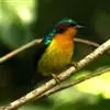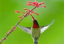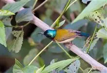 绿喉太阳鸟:共有9个亚种。小型鸟类,雄鸟体长13-15厘米、雌鸟10-12厘米。雄鸟前额至后颈、颏和喉辉绿色,头侧黑色,颈侧和背暗红色,两肩、下背橄榄绿色,腰鲜黄色,尾上覆羽和中央尾羽暗绿色,…全部>>