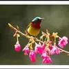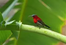 绿喉太阳鸟:共有9个亚种。小型鸟类,雄鸟体长13-15厘米、雌鸟10-12厘米。雄鸟前额至后颈、颏和喉辉绿色,头侧黑色,颈侧和背暗红色,两肩、下背橄榄绿色,腰鲜黄色,尾上覆羽和中央尾羽暗绿色,…全部>>