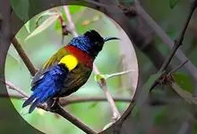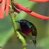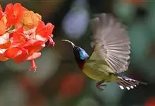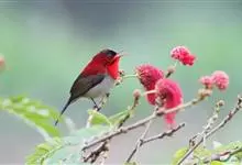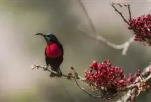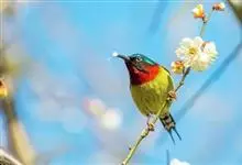 黑胸太阳鸟:小型鸟类,体长9-15厘米。嘴细长而向下曲。雄鸟中央尾羽特长,尾呈楔形,头顶至后颈紫蓝色具金属光泽;背褐红色,腰有一黄色横带,尾上覆羽和尾紫蓝色;颏、喉和上胸乌黑色,有的下胸为硫黄色,…全部>>