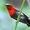 叉尾太阳鸟,雀形目太阳鸟科太阳鸟属留鸟;为小型鸟类,雄鸟头顶辉蓝绿色,上体橄榄绿色,腰明黄色,中央尾羽亮翠蓝色,羽轴针状延长,外侧尾羽黑色具白色端斑,头侧黑色,颜、喉和胸为绛红色,…全部>>