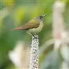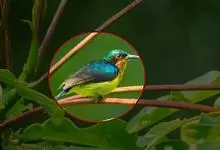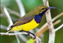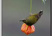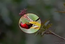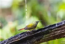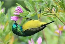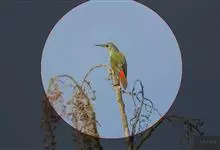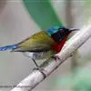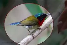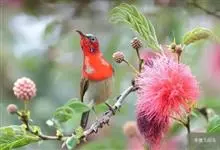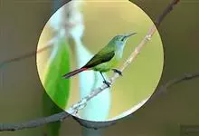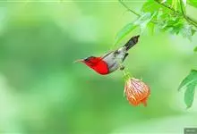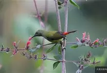 绿喉太阳鸟:共有9个亚种。小型鸟类,雄鸟体长13-15厘米、雌鸟10-12厘米。雄鸟前额至后颈、颏和喉辉绿色,头侧黑色,颈侧和背暗红色,两肩、下背橄榄绿色,腰鲜黄色,尾上覆羽和中央尾羽暗绿色,…全部>>