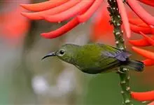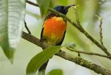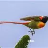 火尾太阳鸟为太阳鸟科太阳鸟属的鸟类。体长20厘米,色彩艳丽。雄鸟红色,具形长的艳猩红色中央尾羽。头顶金属蓝色,眼先和头侧黑色,喉及髭纹金属紫色。下体黄色,胸具艳丽的橘黄色块斑。雌鸟灰橄榄色,腰黄,…全部>>