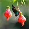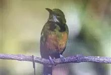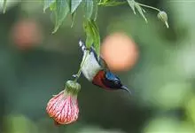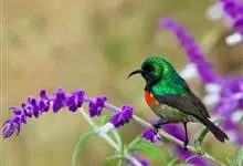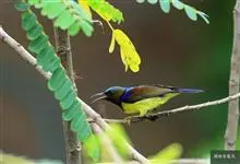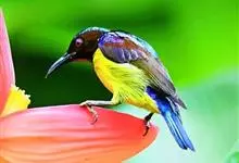 黑胸太阳鸟:小型鸟类,体长9-15厘米。嘴细长而向下曲。雄鸟中央尾羽特长,尾呈楔形,头顶至后颈紫蓝色具金属光泽;背褐红色,腰有一黄色横带,尾上覆羽和尾紫蓝色;颏、喉和上胸乌黑色,有的下胸为硫黄色,…全部>>