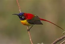叉尾太阳鸟,雀形目太阳鸟科太阳鸟属留鸟;为小型鸟类,雄鸟头顶辉蓝绿色,上体橄榄绿色,腰明黄色,中央尾羽亮翠蓝色,羽轴针状延长,外侧尾羽黑色具白色端斑,头侧黑色,颜、喉和胸为绛红色,…全部>>