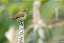 体小而色彩艳丽的太阳鸟。雄鸟:顶冠及上体闪辉深绿色,脸颊深铜红色,腹部黄,喉及胸橙褐。雌鸟:上体绿橄榄色,下体似雄鸟但较淡。…全部>>