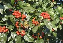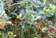 火棘 H. L. Li)是蔷薇科火棘属常绿灌木,老枝呈暗褐色;叶片呈倒卵形,边缘有钝锯齿,齿尖向内弯,两面皆无毛;叶柄短,无毛或嫩时有柔毛;花序是复伞房状,花瓣呈白色近圆形;果球近圆形,…全部>>