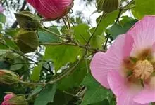 木芙蓉,锦葵科木槿属落叶灌木或小乔木。小枝上有细绒毛;叶片为卵状心形,托叶为披针形,常早落;花单生,花萼为钟形,花冠初为白色或淡红色,后逐渐变为深红色;果实为扁球形,有淡黄色的毛附着。花期8到10月。…全部>>