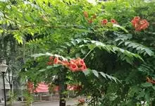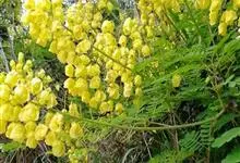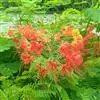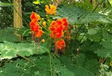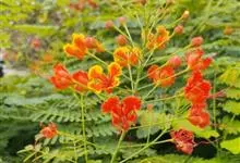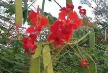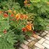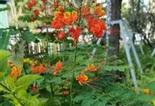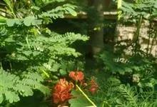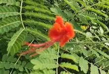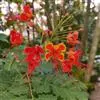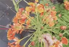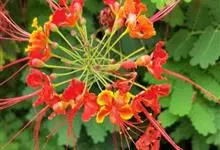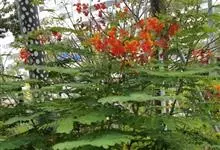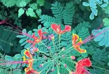 洋金凤 Sw.),豆科小凤花属灌木状或小乔木植物,枝无毛,绿或粉绿色;二回羽状复叶;总状花序伞房状,萼片无毛,花瓣橙红或黄色,圆形,花丝红色,子房无毛,花柱橙黄色;荚果窄而薄,…全部>>
