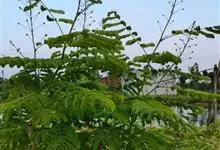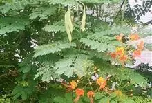 洋金凤 Sw.),豆科小凤花属灌木状或小乔木植物,枝无毛,绿或粉绿色;二回羽状复叶;总状花序伞房状,萼片无毛,花瓣橙红或黄色,圆形,花丝红色,子房无毛,花柱橙黄色;荚果窄而薄,…全部>>