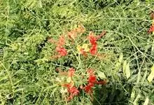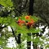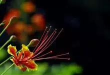 洋金凤 Sw.),豆科小凤花属灌木状或小乔木植物,枝无毛,绿或粉绿色;二回羽状复叶;总状花序伞房状,萼片无毛,花瓣橙红或黄色,圆形,花丝红色,子房无毛,花柱橙黄色;荚果窄而薄,…全部>>