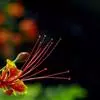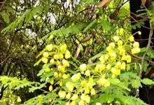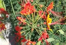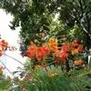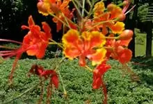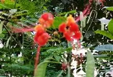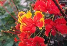 洋金凤 Sw.),豆科小凤花属灌木状或小乔木植物,枝无毛,绿或粉绿色;二回羽状复叶;总状花序伞房状,萼片无毛,花瓣橙红或黄色,圆形,花丝红色,子房无毛,花柱橙黄色;荚果窄而薄,…全部>>