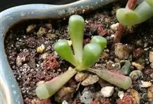 五十铃玉是番杏科窗玉属的多年生肉质植物,别名有“棒叶花”“婴儿脚趾”。植株高5厘米,叶片淡绿色,肉质,叶对生;叶片顶端透明,根部稍暗红色,整体呈细棍棒状;夏末至秋季开花,金黄色;植株不会长高,…全部>>