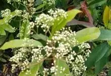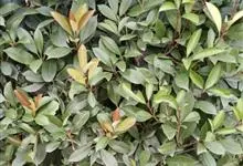 石楠 Kalkman),是蔷薇科石楠属的常绿乔木,高5~12米,株型紧凑,树冠圆球形。树枝为褐灰色;鳞片为褐色,没有毛;叶片革质,长椭圆至侧卵状椭圆形,有锯齿,新叶红色光亮。复伞房花序,白色小花,…全部>>
