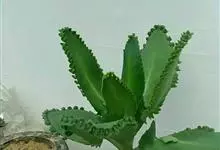 棒叶落地生根是景天科、落地生根属植物。茎直立、粉褐色。叶圆棒形,上表面有沟、粉色,有红褐斑。叶片交互对生,交叉排列成十字形。叶端锯齿上长有很小的幼株、落地后即可生根成活。原产非洲马达加斯加。…全部>>