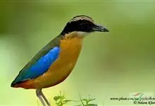 蓝八色鸫是雀形目八色鸫科的鸟类,体长约24厘米,体重109克左右。体型圆胖,尾短,腿长。羽色鲜艳,头顶两侧橘黄色的宽带延伸至颈背,宽宽的过眼纹黑色,脸颊皮黄,髭纹黑,尾亮蓝色。雌鸟较雄鸟色暗,…全部>>