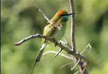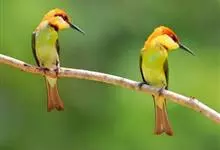 绿喉蜂虎是佛法僧目、蜂虎科的小型鸟类,共有9个亚种。身长22-25厘米,翼展29-30厘米,体重15-20克。喉绿色,额部、头顶至上背为锈红色,其余上体均为亮绿色。中央尾羽延长且端段狭细,…全部>>