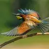 栗喉蜂虎是蜂虎科蜂虎属的鸟类。有热带鸟类羽毛艳丽的特征:喉部是栗红色的,黑色的过眼纹,翅膀和背部是绿色的,尾翼是蓝色的,飞行时翅膀下面的羽毛是橙黄色的,在阳光的照射下,它们全身闪烁着金属般的艳丽光泽,…全部>>